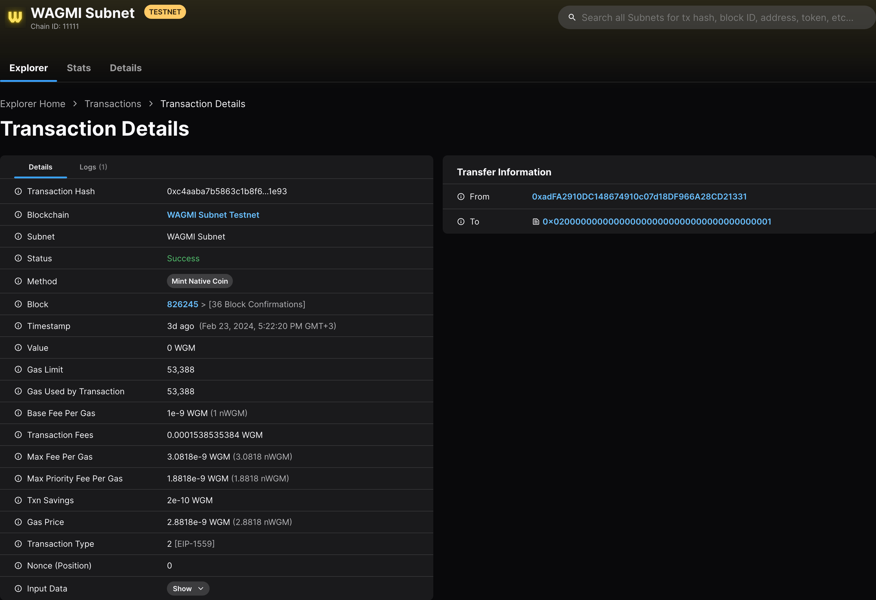 As a result of this transaction, the native minter precompile minted a new native coin (1 WGM) to the recipient address 0xB78cbAa319ffBD899951AA30D4320f5818938310. The address page on the explorer here shows no incoming transaction; this is because the 1 WGM was directly minted by the EVM itself, without any sender.