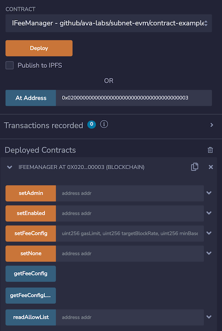 IFeeManager is our precompile, but it references the IAllowList, so we need that one as well. We compile IFeeManager.sol and use deployed contract at the precompile address 0x0200000000000000000000000000000000000003 used on the Avalanche L1.